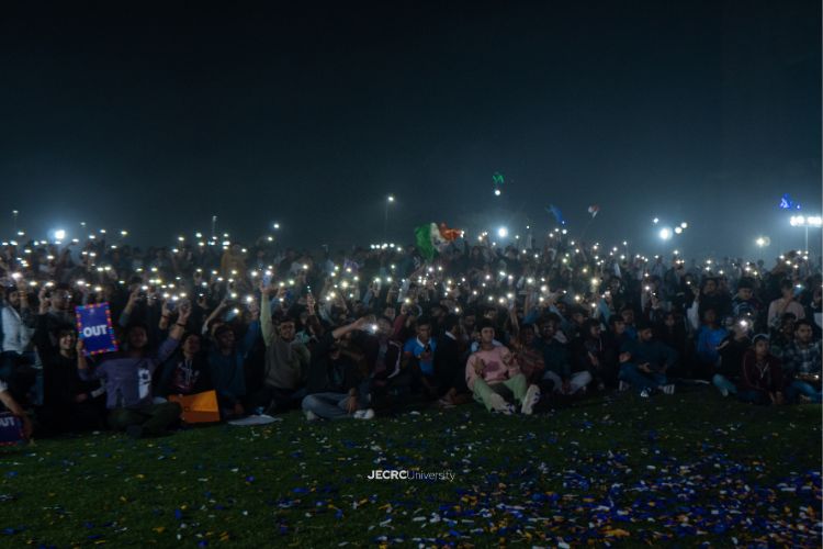Seeing the enthusiasm of the student he played a legendary and also the song that unites the nation, the winner of the Oscar, “Vande Mataram” by the legend AR Rahman. Everyone present here united and sang together to show their support towards Team India. But these moments of happiness were of fractions of time of the match, after the third wicket there was not any wicket and the win was slipping from the hand like sand as soon as time passed. India was close to losing the tournament; seeing this here at university everyone was depressed, the excitement that was surrounding the ground was converting into the atmosphere of sadness. After waiting for long hours, the match was over, and India lost by 6 wickets. The sense of disappointment and sadness was struck. Then Kartik Sir came forward to cheer up the student, and his words were as follow “the team gave their all and we should not be sad and worried. Think about what the team was going through and said we will celebrate as if Team India won the match. Celebrations are need to be done that our team came this far and gave a tough competition to the 5-time world winner that’s not what we see every day”. After the speech, the fireworks were fired and celebration begin. After all the efforts the team JUSOCIALZ put into it was worth it. We know that we didn’t win, but these moments are the times that we tell to our upcoming generation. And Also this was possible due to Jecrc university efforts as they knew the importance of this and gave permission to host this amidst the exams. There is a saying that goes It’s never been and never will be about emerging victorious; it’s about wholeheartedly giving your best.